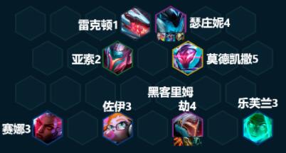 阵容组成:雷克顿、瑟庄妮、亚索、莫德凯撒、赛娜、佐伊、劫、乐芙兰
