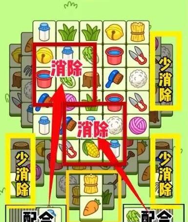 第六步,前期尽量少消除黄色区域,尽量去消除暗牌区的牌配合主消区进行消除。