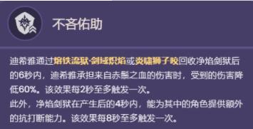 迪希雅通过熔铁流狱剑域炽焰或炎啸狮子咬回收净焰剑狱后的6秒内,迪希雅承担来自赤鬃之血的伤害时,受到的伤害降低60%。该效果每2秒至多触发一次。