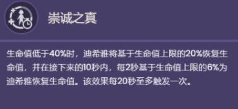 生命值低于40%时,迪希雅将基于生命值上限的20%恢复生命值,并在接下来的10秒内,每2秒基于生命值上限的6%为迪希雅恢复生命值。该效果每20秒至多触发一次。