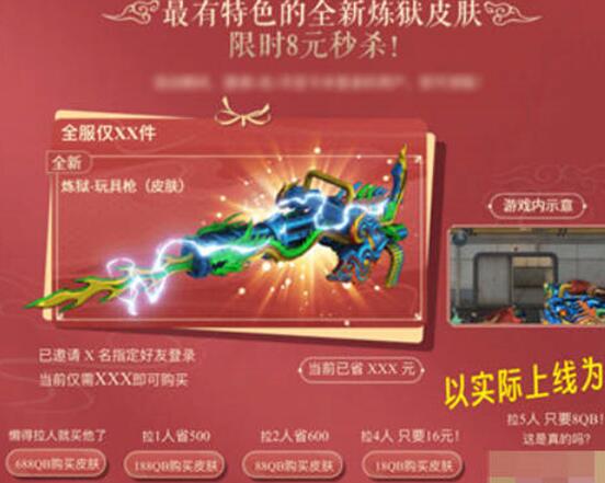 4:同时还有八元秒杀的活动,炼狱玩具枪皮肤邀请五人就可以用八块的价格拿下这个皮肤,但是邀请人的任务还是比较难做的。