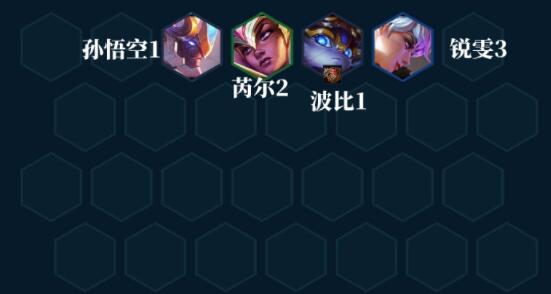 阵容组成:波比、芮尔、孙悟空、锐雯(没有锐雯可以替换成任意2星后排输出卡,或者直接上两个波比也行)