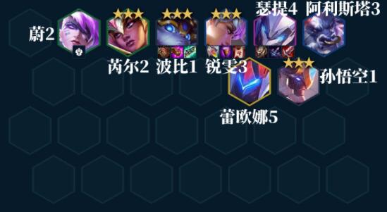 阵容组成:孙悟空、瑟提、锐雯、蕾欧娜、芮尔、阿利斯塔、波比、蔚