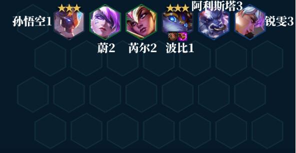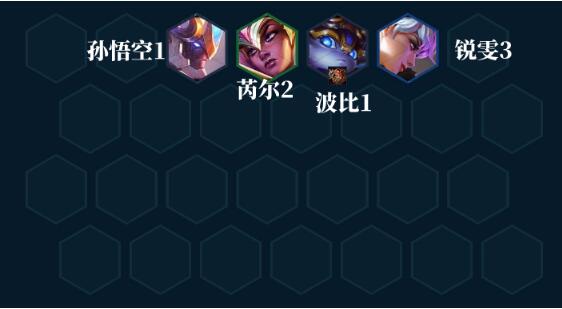 阵容组成:波比、芮尔、孙悟空、锐雯(没有锐雯可以替换成任意2星后排输出卡,或者直接上两个波比也行)