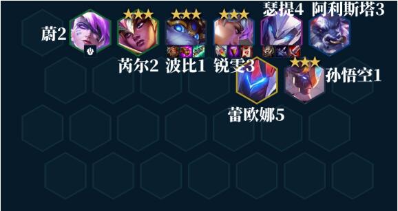 阵容组成:孙悟空、瑟提、锐雯、蕾欧娜、芮尔、阿利斯塔、波比、蔚