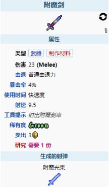 附魔剑是一把非常稀有的剑。它能自动挥舞,发射剑形射弹且不消耗任何弹药或魔力。剑和其射弹都会在轨迹上残留火花,发出大量光线。射弹大概每隔 1-2 秒能发射一次。