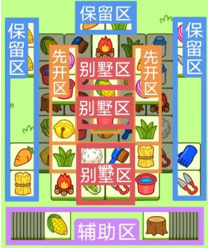 两个长形别墅,一个方形大别墅,开局先消除橙色区。这里压牌比较多,然后按照一层层均匀消除表面牌。让牌面保持在同水平面上。必要时可以用盲盒区辅助消除表面牌。尽量还是以别墅区内互相消除为主,蓝色区有叠牌,但是不多, 全部保留到后期使用。