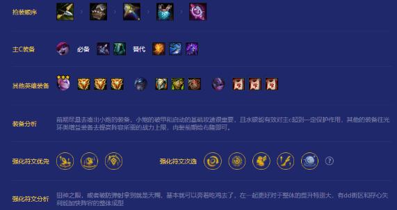 前期尽量去凑出小炮的装备,小炮的破甲和启动的基础攻速很重要,且水银能有效对主c起到一定保护作用,其他的装备往光环类增益装备去提高阵容所需的战力上限,肉装前期给布隆即可。
