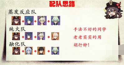 1、胡桃最好用的队伍胡行钟:胡桃+行秋+钟离。可替代的角色在图片中已经给出。