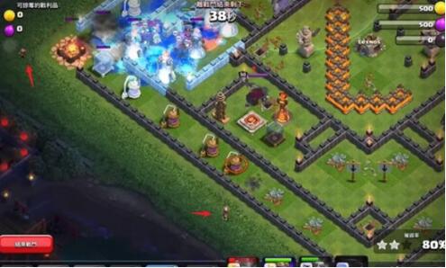 等待援军城堡被打掉后,在靠近城墙一侧下一个超级哥布林引出飓风陷阱,记得要在靠近城墙那一侧下超级哥布林,因为另一侧陷阱超级多。