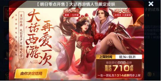 2、返场皮肤:孙悟空至尊宝/大圣娶亲/美猴王、露娜&孙悟空一生所爱;