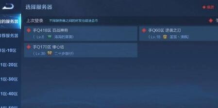 2.点击换区后会进入选择服务器界面,当前界面左侧栏中我的服务器会显示曾经登陆过的区以及该区角色的段位,同时也会显示上次登录的服务器。忘记了之前登陆过的区可以在这里可以找回