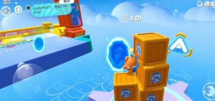 1、技巧考试一,这里捡道具变小,通过障碍物。然后拿这个传送球丢到对面传送过去即可