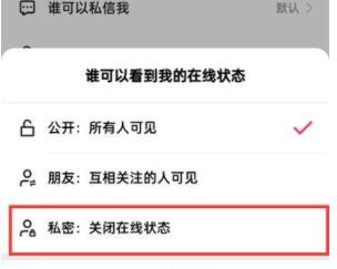 5、最后在页面下面弹出的选项中点击【私密:关闭在线状态】即可。