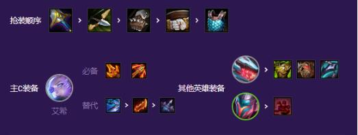 这套体系核心输出是寒冰,优先做好她的神装,任意的AD输出装均可,其中轻语必备,否则遇到高护甲体系可能很难清掉前排,其余两件最好就是杀人剑+飓风,或者是巨杀、无尽、羊刀等常见的AD装。肉装则给到鳄鱼,多余的输出装给亚索。
