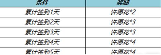 每天签到可以领取的许愿花数量是不同的,持续签到6天累计可以获取到20许愿花;