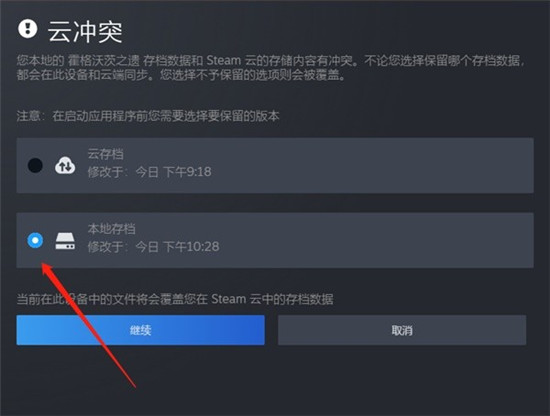 即可恢复steam的云存档,恢复后打开游戏提示如下,我们选择用本地数据覆盖云端数据即可。