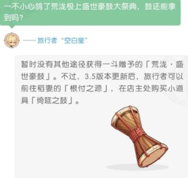 “3.5版本更新后,旅行者可以前往稻妻的「根付之源」,在店主处购买小道具「绮筵之鼓」”