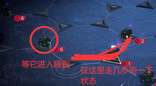 然后先去左边的叹号,沿着路线走,过来红色框框的黑影可能是警戒状态,在旁边绕一下,等它进入睡眠状态后过去踩红叹号救出澈。