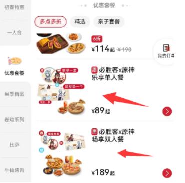5、紧接着开始进入点餐页面,在【优惠套餐】栏目找到原神联动套餐,目前仅开放了两款。