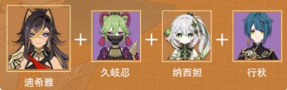 “纳行久”组合有着高下限的输出水准作为保障,迪希雅入队后利用元素战技的协同挂火可以触发多种元素反应,同时进一步提高纳西妲站场时的抗打断能力以及减伤效果,降低了堆叠全精通的久岐忍导致治疗量减低带来的容错率降低的影响。