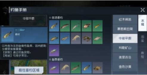 2、在钓鱼手册的中部平原、科勒矿山、金色沙漠中找到大口黑鲈,然后点击左下角的【前往垂钓区域】;