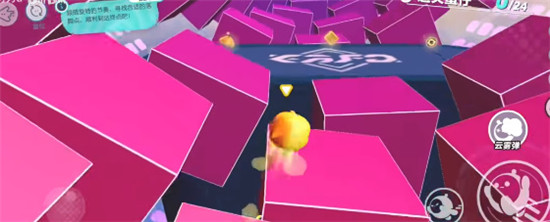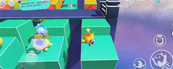 2、厉害的小蛋仔可以等滚动冷却好了直接开技能翻滚+跳跃快速通过第一个和第二个旋转方块区域;