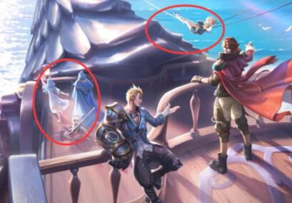 2、早在莱西奥的开航海报上就有这位新英雄的背影,下图左侧红圈内少女就是人鱼公主了,另一位英雄可能是八神庵。