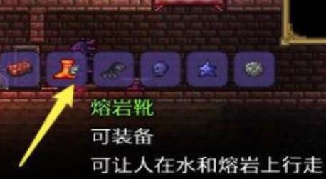 2、熔岩靴,是一件允许玩家在所有的液体表面行走的配饰,液体包括水、蜂蜜,甚至是熔岩。然而并不会受到熔岩的伤害,也不会获得着火了减益。熔岩靴也允许玩家安全地浸没于熔岩中7 秒。熔岩靴和熔岩护身符叠加,可以将熔岩免疫时间增加到14秒。熔岩靴由熔岩护身符与黑曜石水上漂靴合成得到。