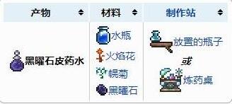 3、在药桌消耗水瓶、火焰花、幌菊和黑曜石合成黑曜石皮药水。使用后玩家将在6钟内获得免疫,不会被熔岩烫伤。