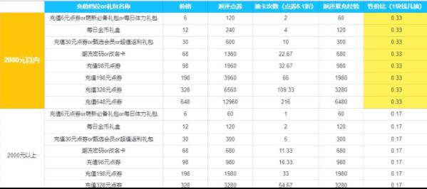 表格中分为2000以上和以下的玩家群体,结合返利的来选择时候自己的氪金思路。