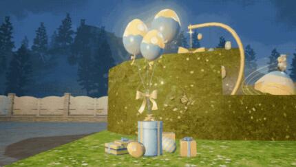 堆叠的礼盒上系着一束波点彩蛋气球灯,灯光照亮了夜色的一隅,为幸存者点亮了回家的路,蛋黄蝴蝶结在灯光照耀下泛起光泽,时不时闪烁星光,为幸存者们带来希望光芒。