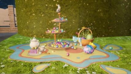 不规则形状的甜品桌上铺盖蓝黄橙三色餐布,三层高的圆形甜品架上白兔手捧彩蛋,层层堆叠各色糖果,花篮、茶壶、蛋糕、彩蛋散布桌台,即便外面的世界危机四伏,在温馨家园里也能享用一顿惬意的下午茶。