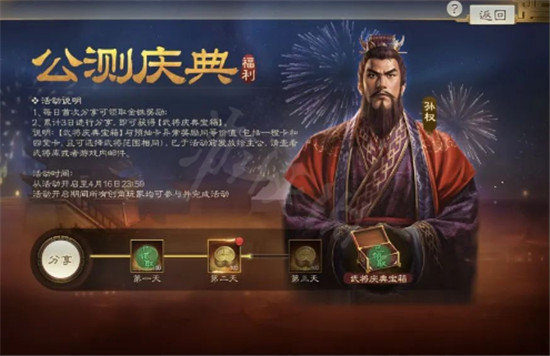 2、参与了游戏预约期预抽卡活动,但未领取奖励的玩家,完成三日分享任务,可获得【武将庆典宝箱】和300金铢;