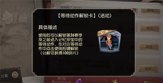 5、第二周的最终奖励是【等待动作解锁卡】。(使用后可以解锁第26赛季及之前进入以及珍宝中的等待动作)