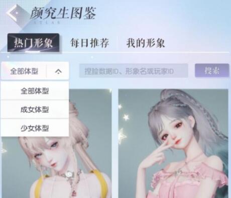 我们选择第一个“热门形象”,然后点击全部体型里选择想要的体型,之后就会在界面上看到关于此体型最多人选择的捏脸数据,然后我们选择出一个自己喜欢的并点进此体型,然后复制或者导入此数据就可以获得了。