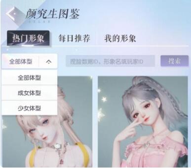 我们选择第一个“热门形象”,然后点击全部体型里选择想要的体型,之后就会在界面上看到关于此体型最多人选择的捏脸数据,然后我们选择出一个自己喜欢的并点进此体型,然后复制或者导入此数据就可以获得了。