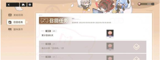 2、成功邀请玩家回归就可以获取奖励了,完成召回任务获取而定货币可以在【猫咪黑市】中可以兑换资源道具奖励;