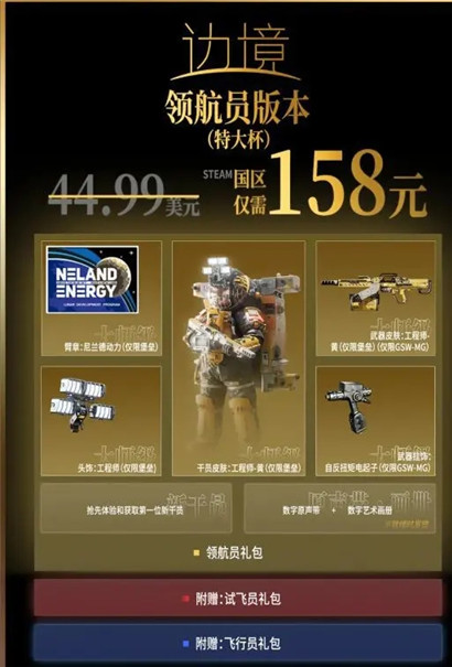 包含飞行员版本与试飞员版本所有内容,以及大师级臂章尼兰德动力、大师级头饰工程师、大师级武器皮肤工程师、大师级干员皮肤工程师、大师级武器挂饰自反扭矩电起子、抢先体验和获取一位新干员和游戏的数字原声带、艺术设定集。