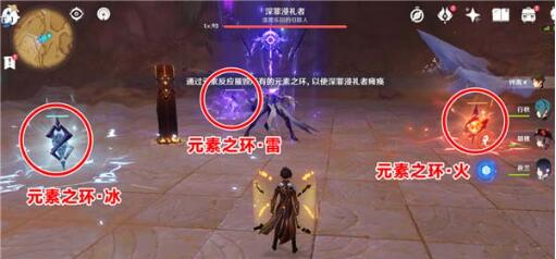 深罪浸礼者开局会生成三个出战元素的元素之环,通过元素反应破坏后能使敌人造成一定时间的瘫痪效果。