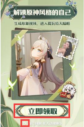 3、勾选同意活动规则,点击立即领取,导入图片,即可生成原神形象。