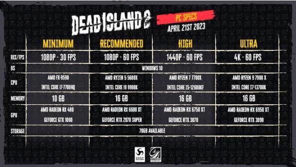 《死亡岛 2》1080p 30fps 最低画质需要 GTX 1060 显卡,1080p 60fps 推荐画质需要 RTX 2070 Super 显卡,1440p 60fps 高画质需要 RTX 3070 显卡,4K 60fps 最高画质需要 i7-13700K 处理器和 RTX 3090 显卡。