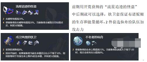 2、前期用开荒获得的“流星追迹的怪盗”中后期就可以选择,铁卫套保证布诺妮娅的生存和能量循环,2件套选仙舟给队伍加攻击力