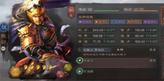 张郃用这个技能就是神技,伤害系数提升到了108%,流血三回合总伤害108×4=436!再带个百折不挠提升生存能力,多刮几回合这伤害谁遭得住!当然也可以带浴血破虏+见血封喉,伤害会更高就是生存能力低了点,需要搭配个辅助。