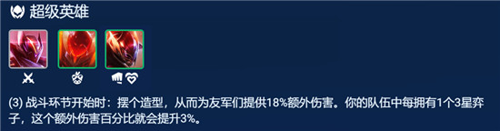 这套阵容建议搭配3超英羁绊,在4枚棋子三星后就能增加全员30%的额外伤害,输出强度特别高。
