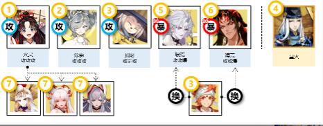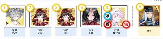 【替换】缘结神可换成稻荷神御馔津、浮世青行灯、不知火,御魂均攻击 2 件套沉底,但时间会慢 2-4s。神堕八岐大蛇和阿修罗可换成单个输出搭配食灵,但时间需要 24-25s
