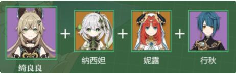 绮良良具有较高的护盾量,可以很好的保障前台站场角色不被丰穰之核的伤害波及导致血量过低。纳西妲前台站场补充草元素,队伍主要以丰穰之核的伤害为主。