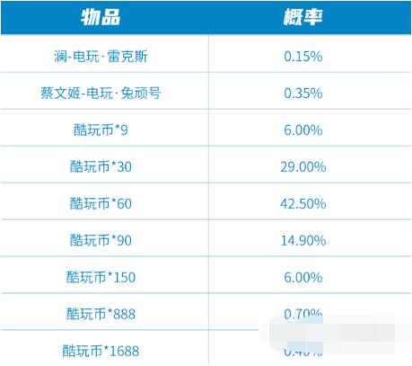 购买礼包必得酷炫机甲(1日),可额外随机获得以下之一:澜-电玩·雷克斯、蔡文姬-电玩·兔顽号、酷玩币*1688、酷玩币*888、酷玩币*150、酷玩币*90、酷玩币*60、酷玩币*30、酷玩币*9。