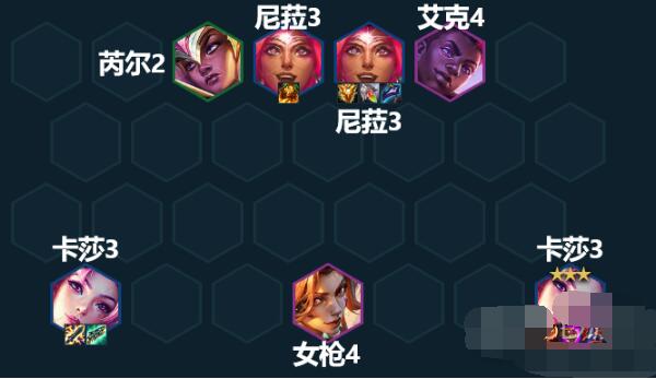 2.没有拿到芮尔-坚守防线的情况下,升7人口后攒钱慢D三星卡莎和三星的尼菈。 因为在这种情况下,一般会使用尼菈作为主t,7人口搜三费卡的概率为35%,和8人口并列最高。
