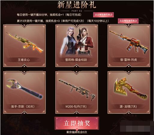 CF WeGame一键开播活动怎么参与?相较于手游来说,穿越火线端游推出的活动将会更多,不仅仅是官方自己推出的活动,还会与其他平台合作共同推出活动,任何玩家都能参与进来,在活动时间内完成任务,都能领取到丰富的游戏道具奖励,甚至是永久武器也能直接拥有呢。如果想要感受一下做主播的体验,可以参与到WeGame推出的一键开播活动,活动时间将维持一个月,持续要满足任务要求就能连续获得多种奖励,除此之外每天开播三十分钟,可拥有一次抽奖机会,第三天还能多加三次,除了王者炎心以外,还能得到永久的雪莉杨-摸金校尉呢,赶紧来试试吧。
